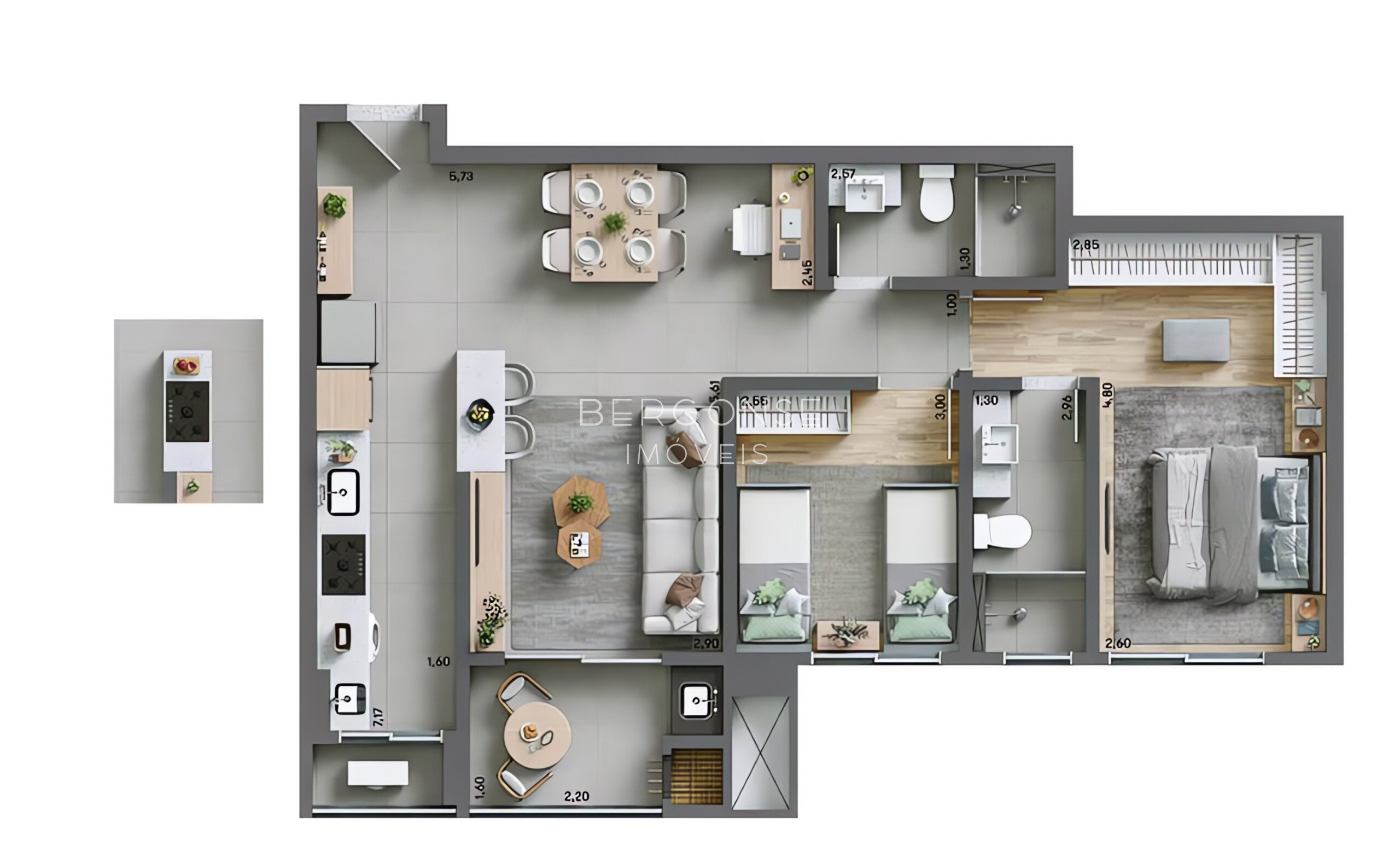 A área íntima dispõe de 2 dormitórios, sendo 1 suíte, além de banheiro social. A cozinha é funcional e integrada à área de serviço, oferecendo praticidade no dia a dia.