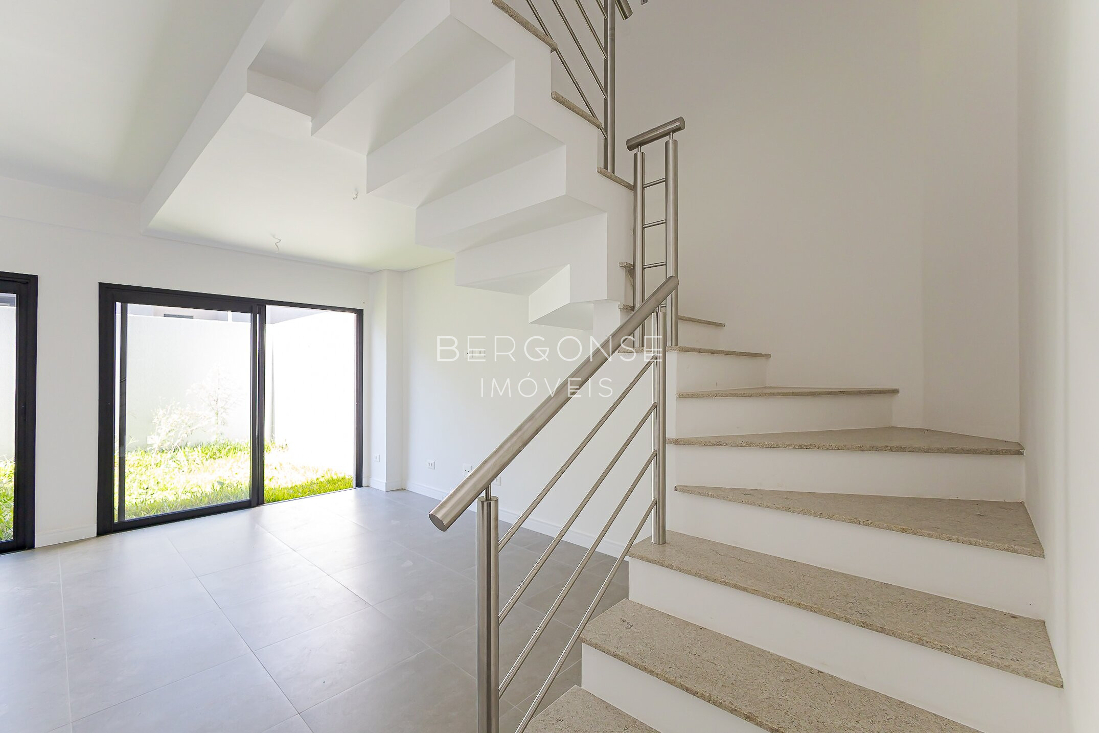 Detalhes de Luxo: Escada em granito com guarda-corpo em aço inox escovado e fachada moderna em grafiato e litocerâmica.