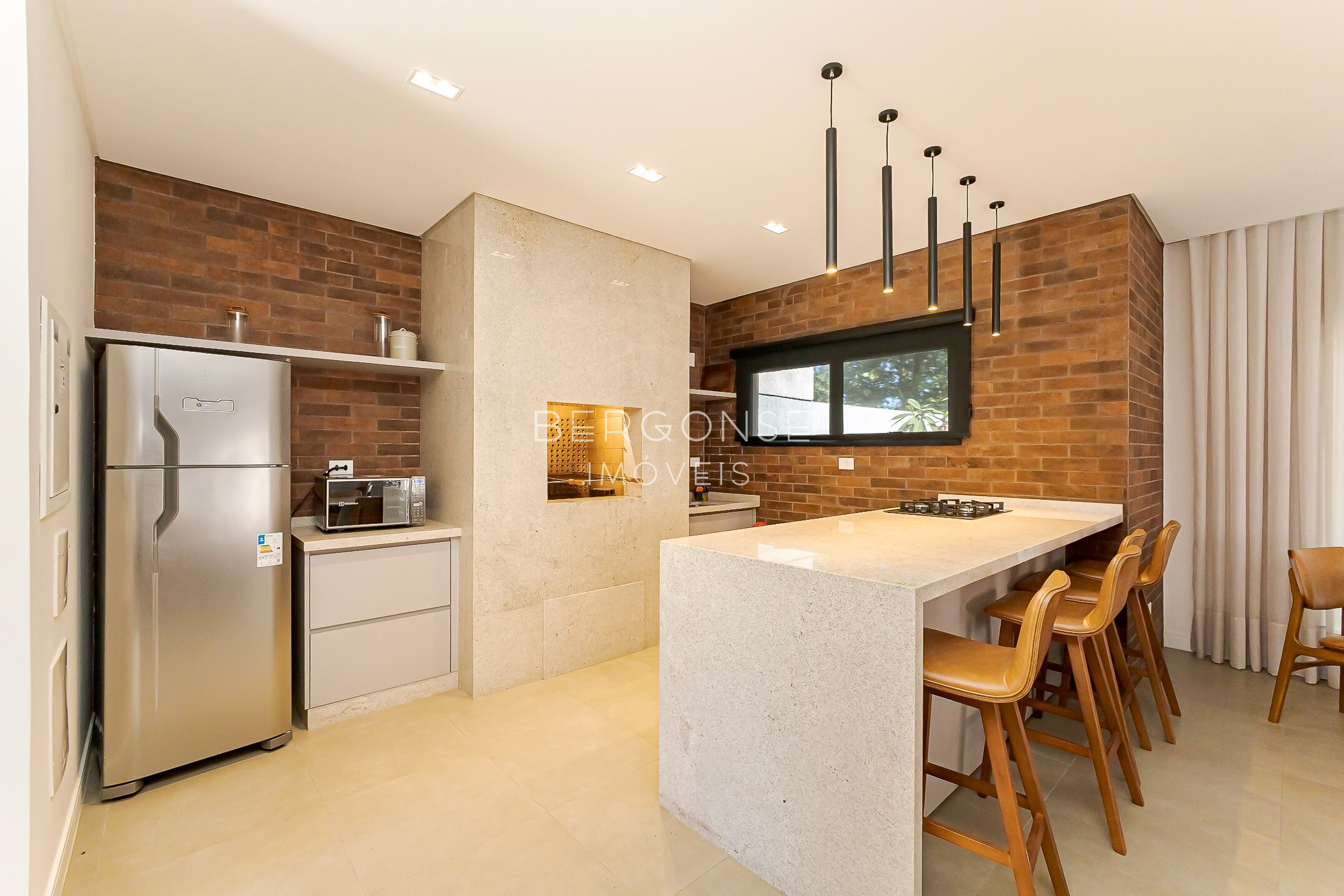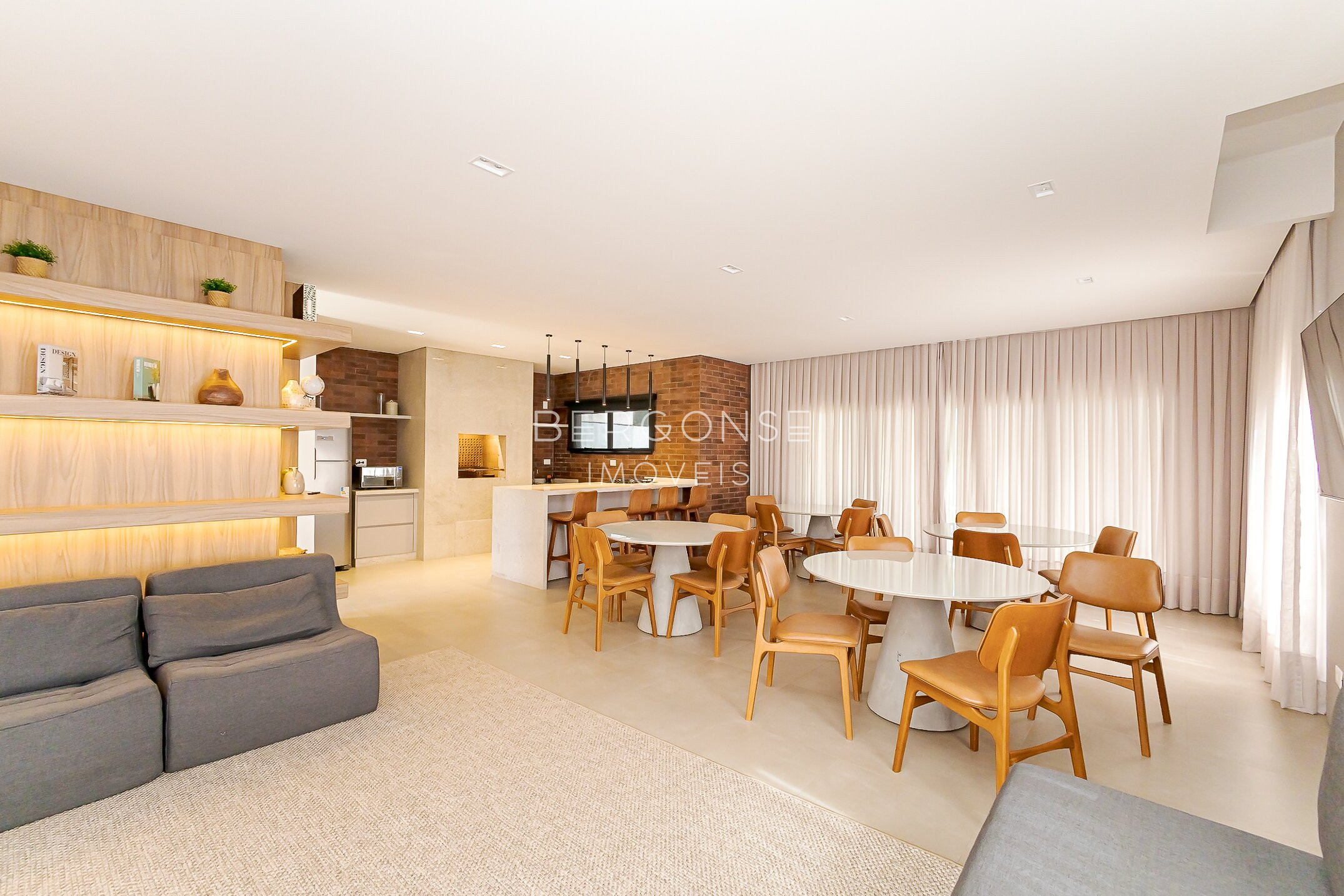 Convivência no Térreo: Living totalmente integrado, unindo as salas de estar, jantar e cozinha com elegância e piso em porcelanato.