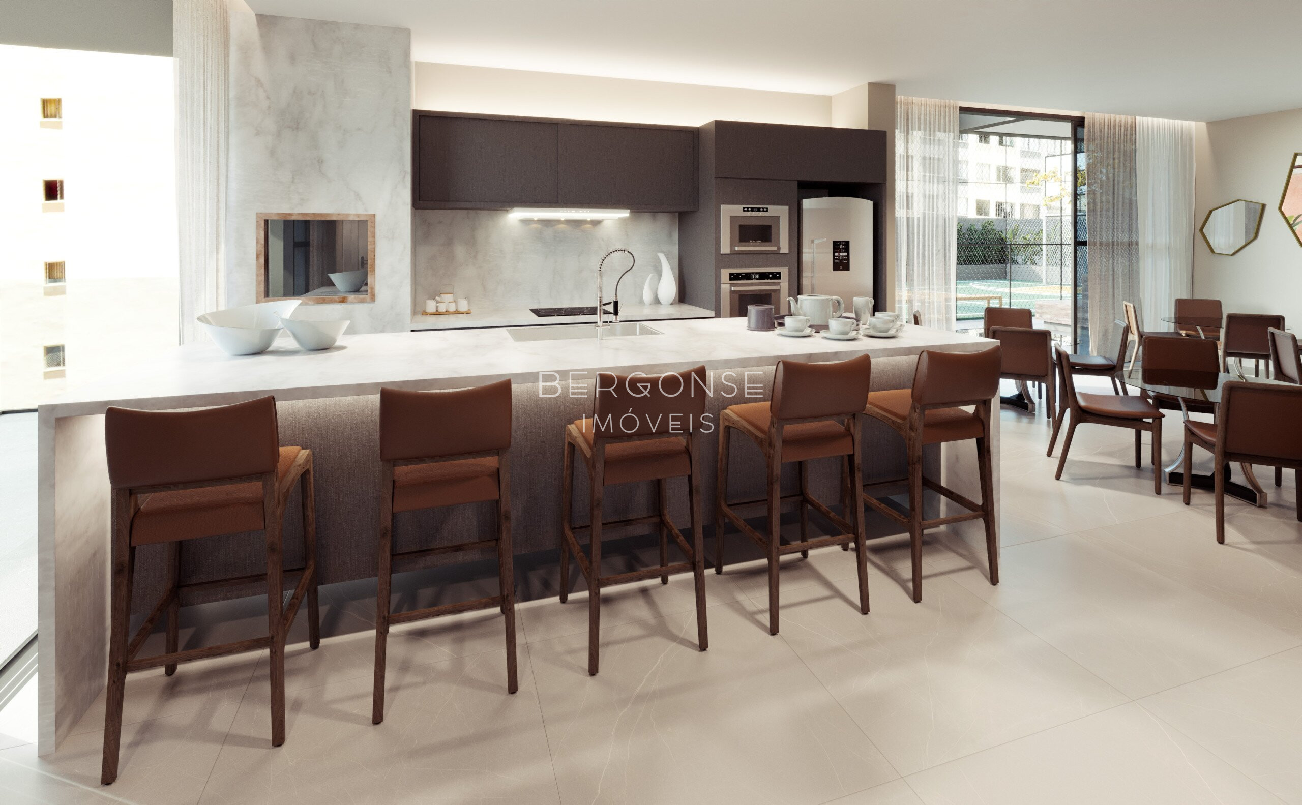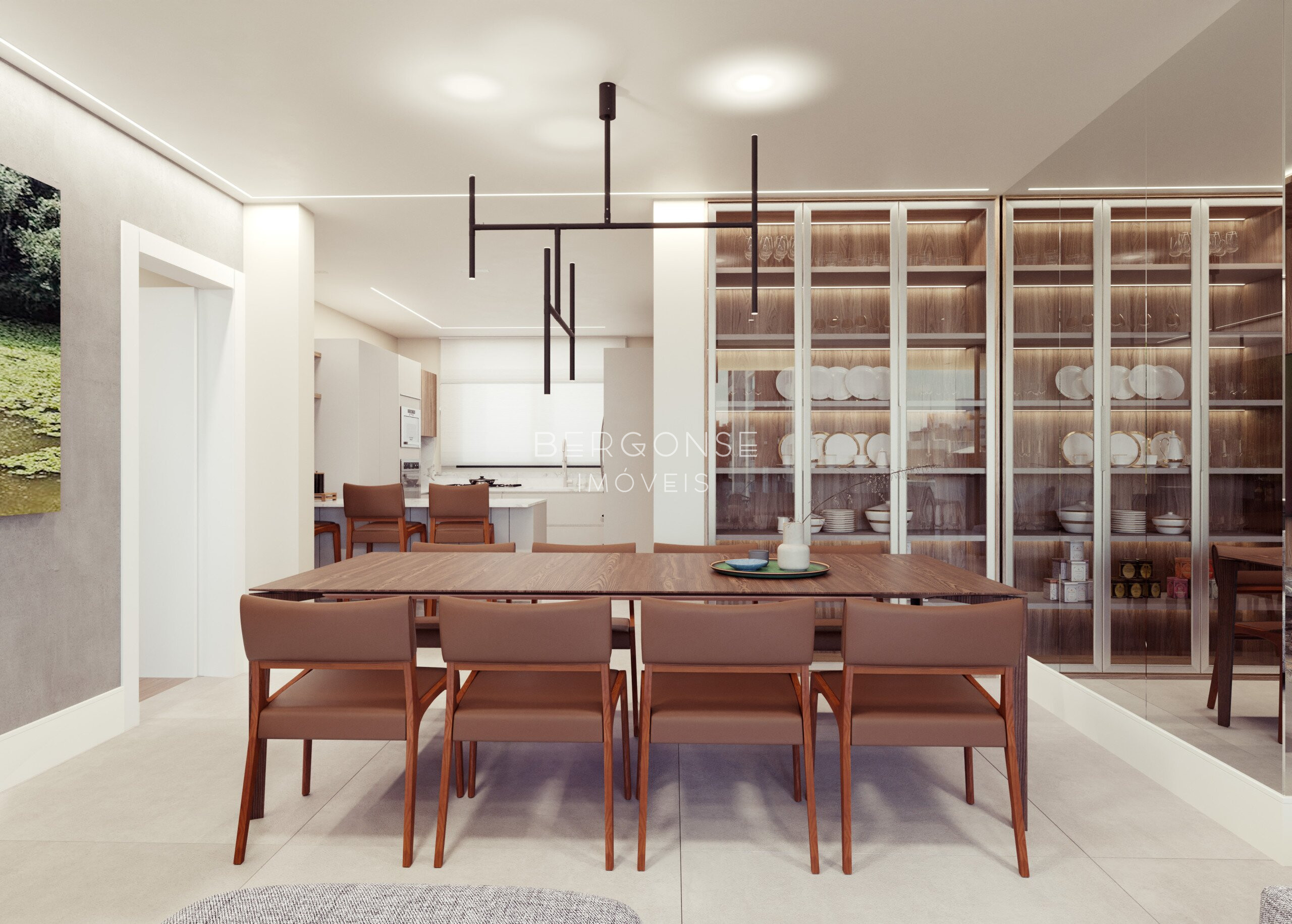 Espaço Social Integrado: Living monumental e sala de jantar que se conectam harmoniosamente à cozinha, criando um ambiente fluido e iluminado.