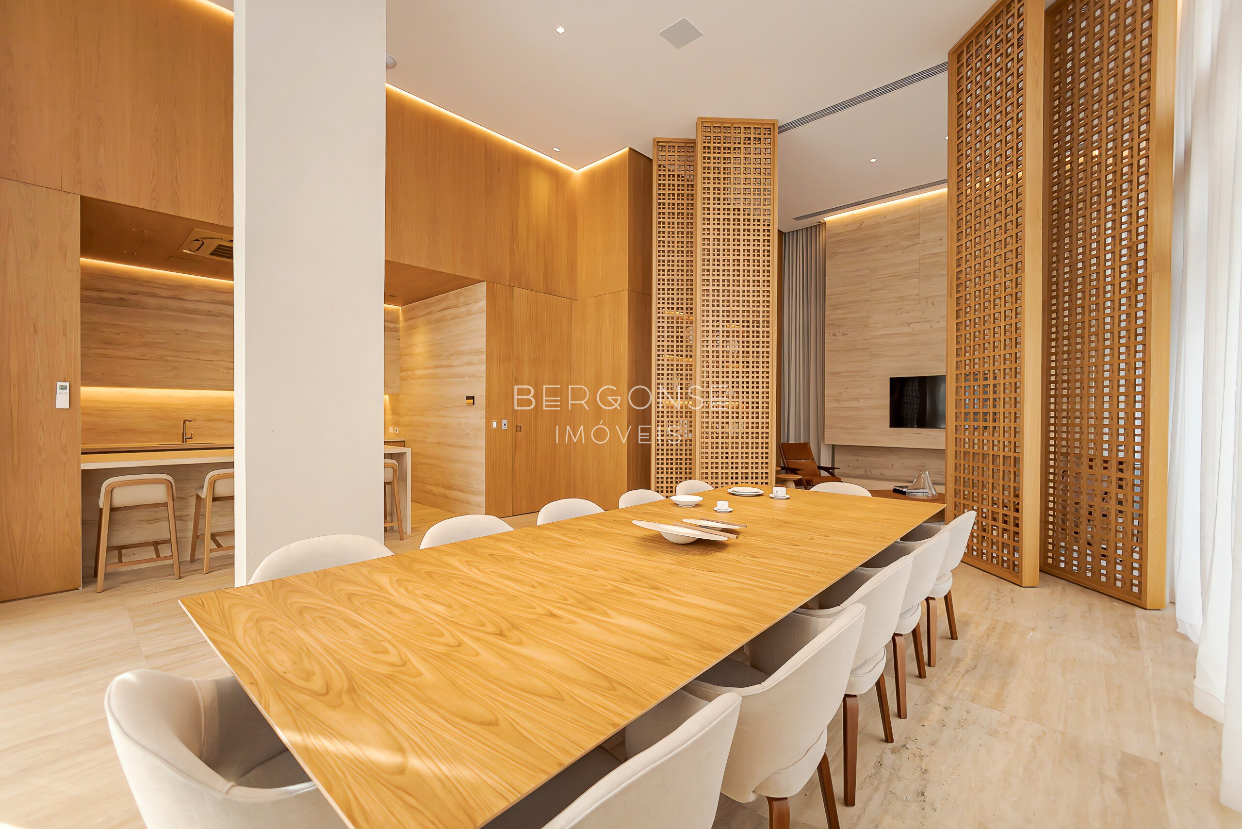 Amplo living para vários ambientes, com integração perfeita entre sala de estar, jantar e home theater
